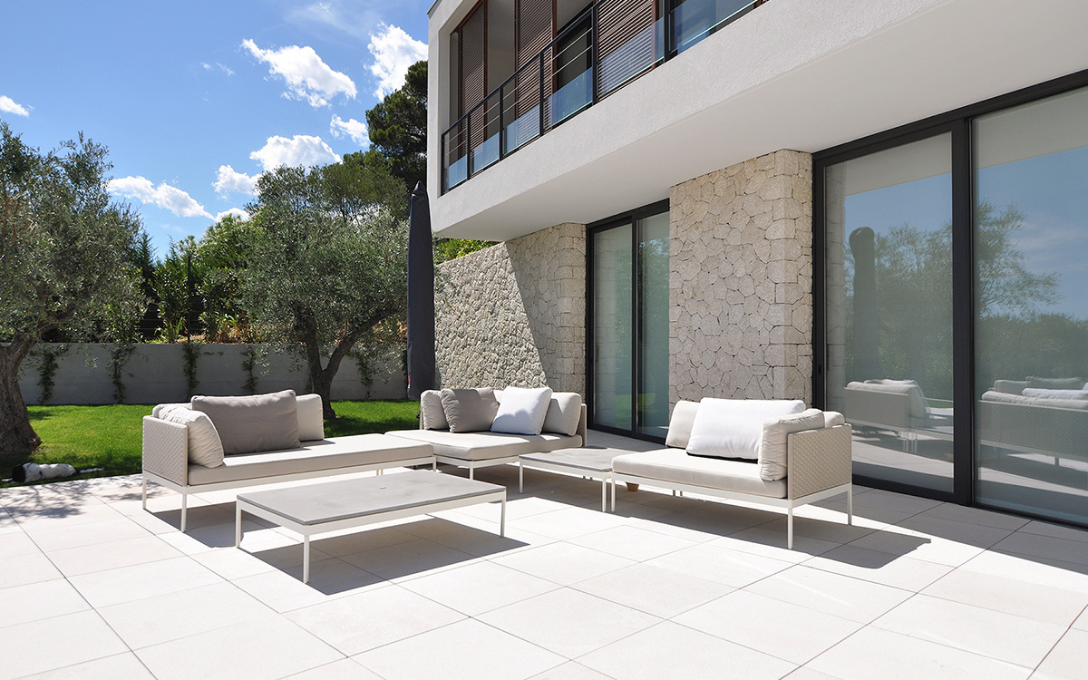 E’ così che grosse pareti vetrate e muri squadrati si miscelano in modo perfetto ai prodotti scelti per l’arredo interno ed esterno di questo progetto.