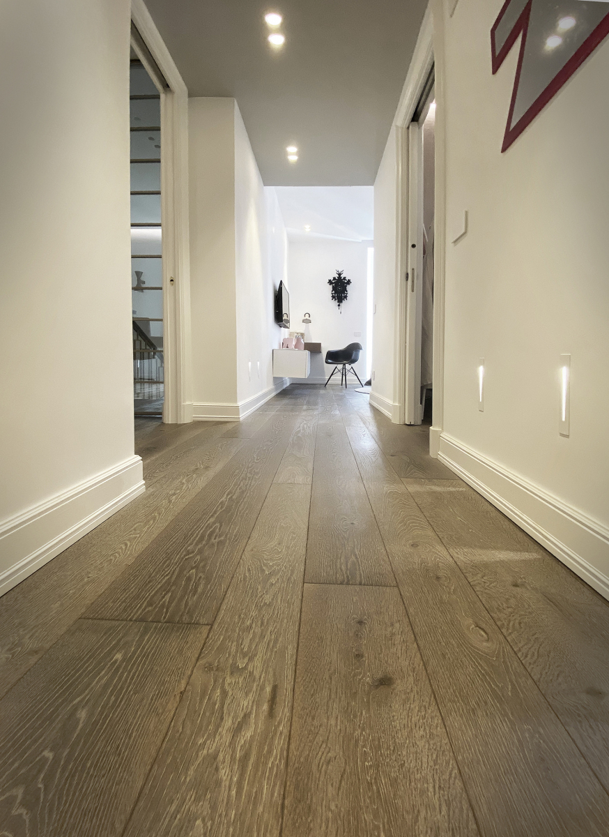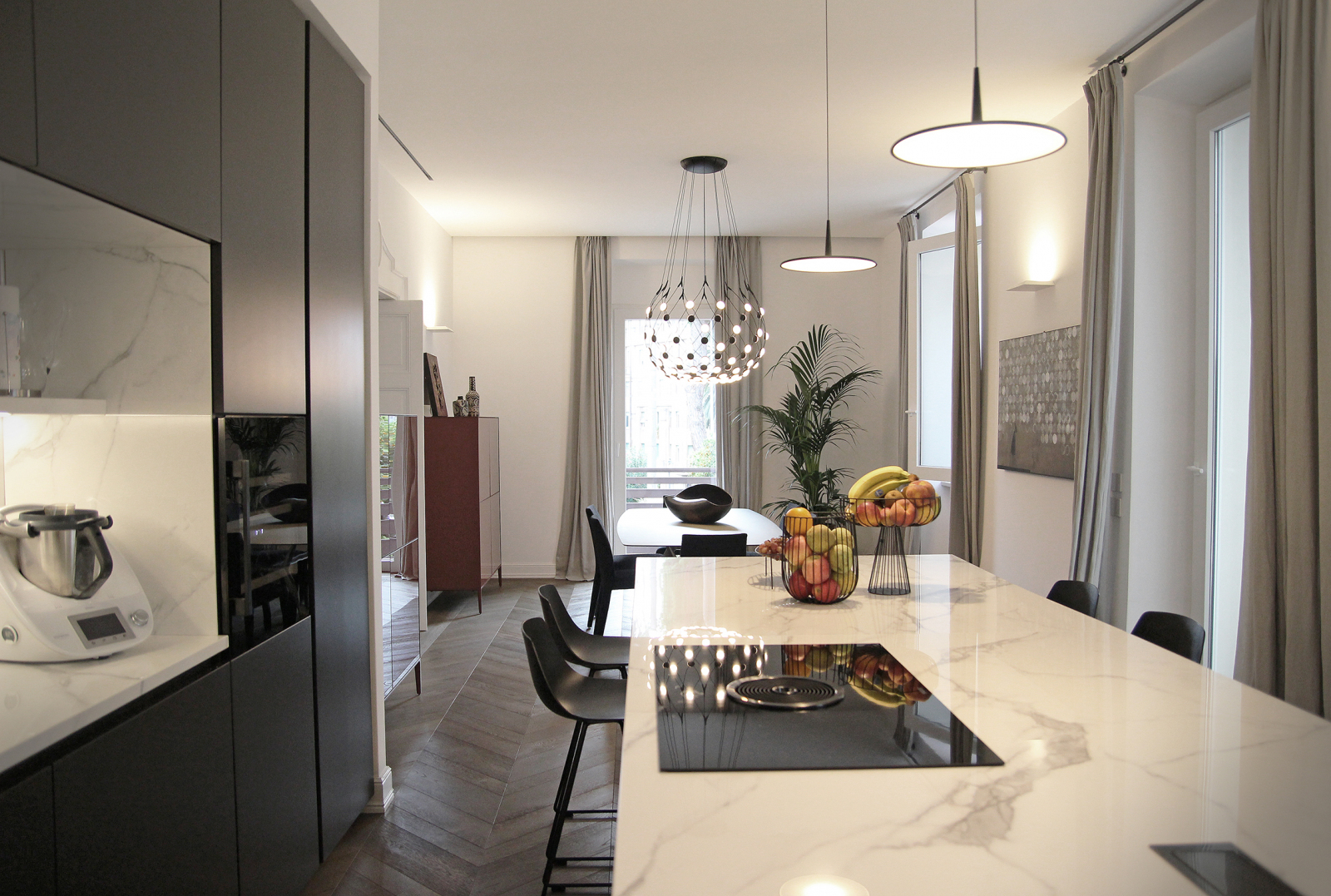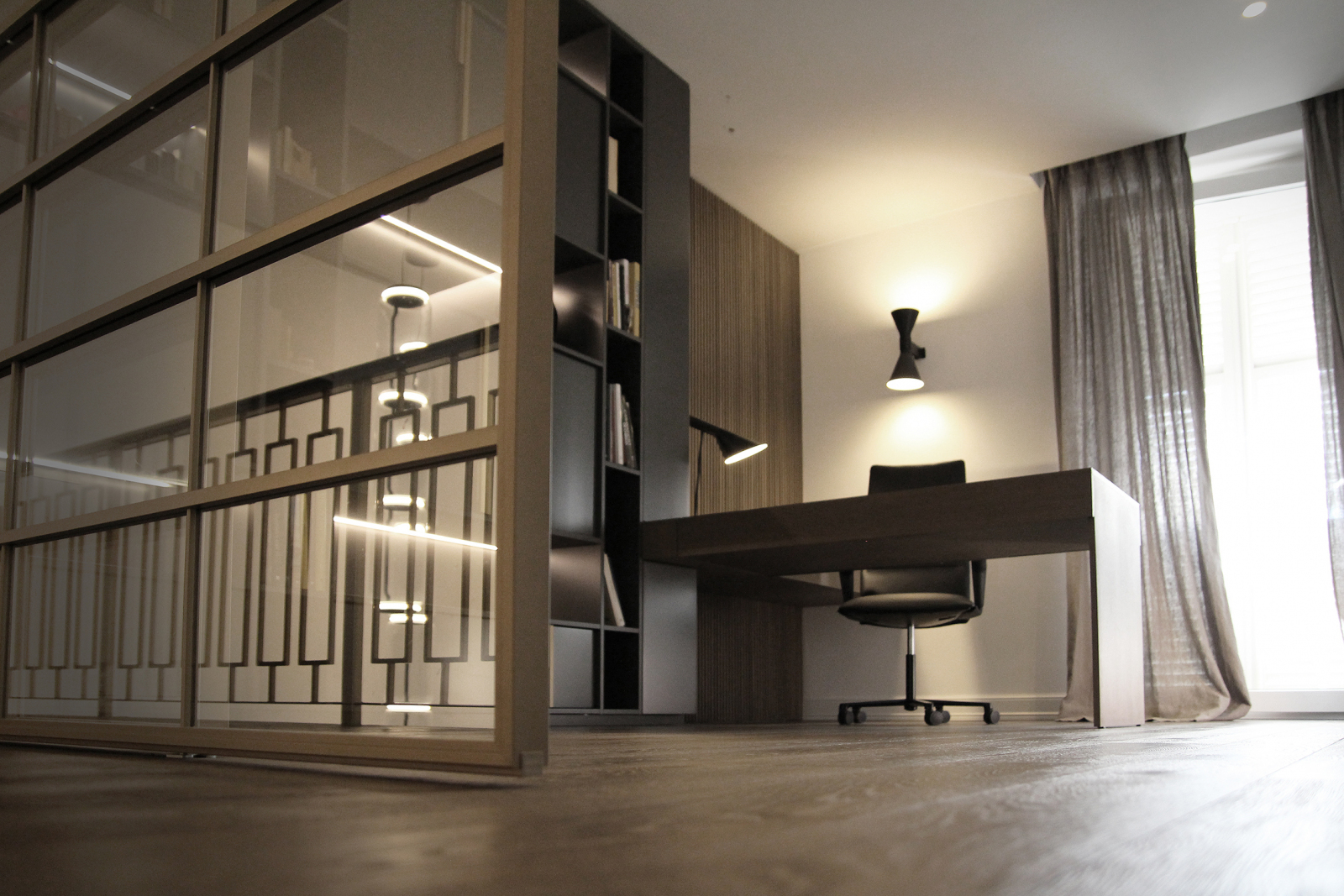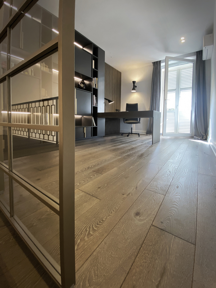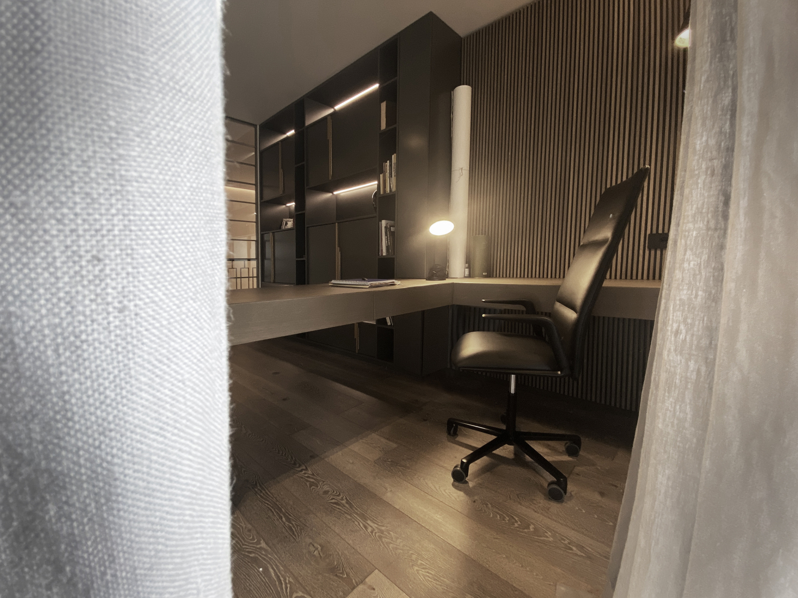 Per garantire un’armonia estetica tra la zona giorno e la zona notte, sono stati utilizzati pannelli scorrevoli Soho di Rimadesio. Questi elementi non solo suddividono gli spazi in modo funzionale, ma aggiungono anche un tocco di eleganza e modernità agli ambienti.