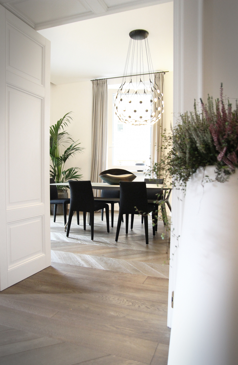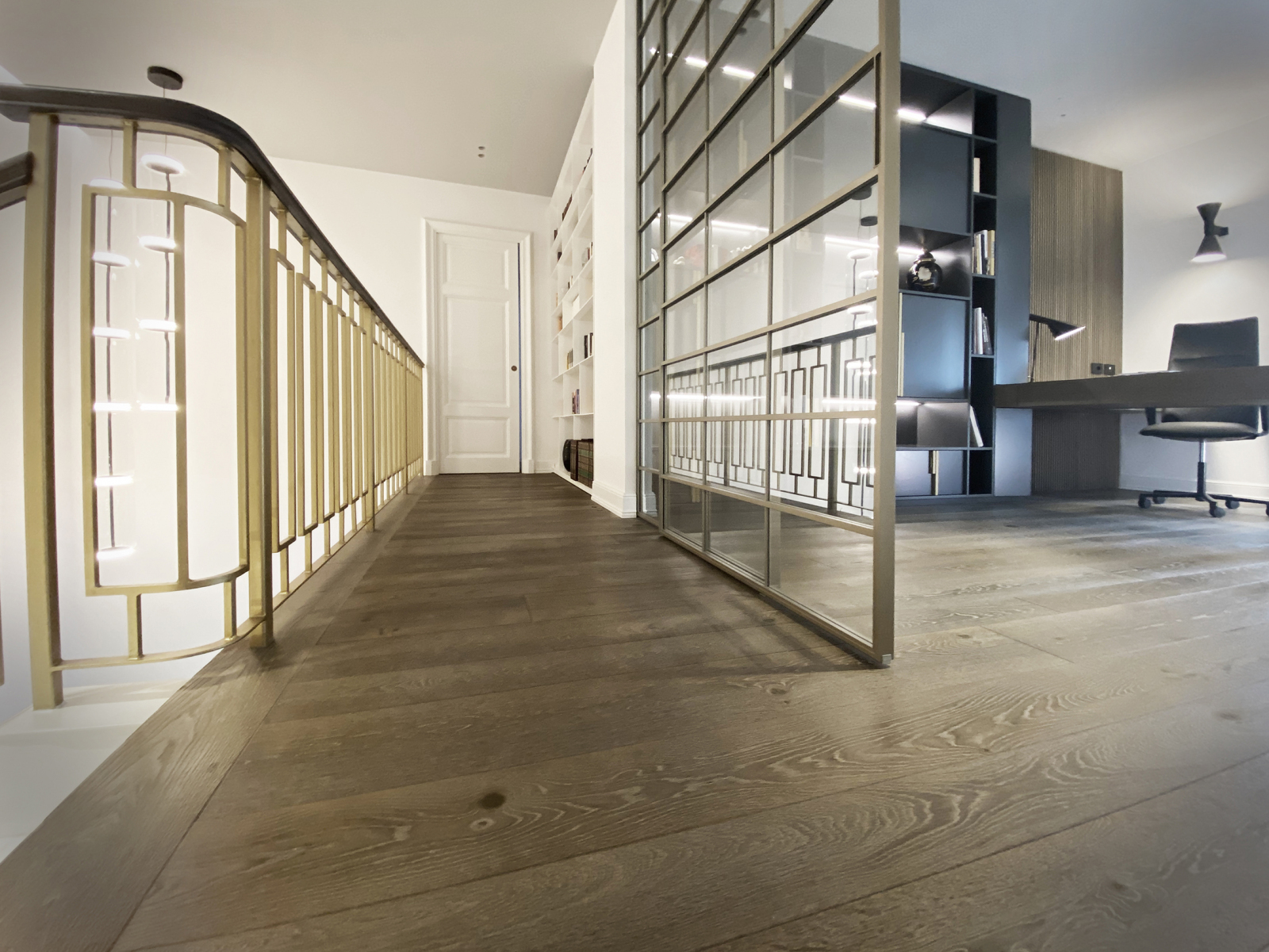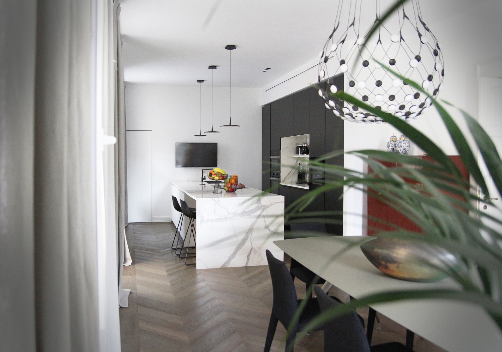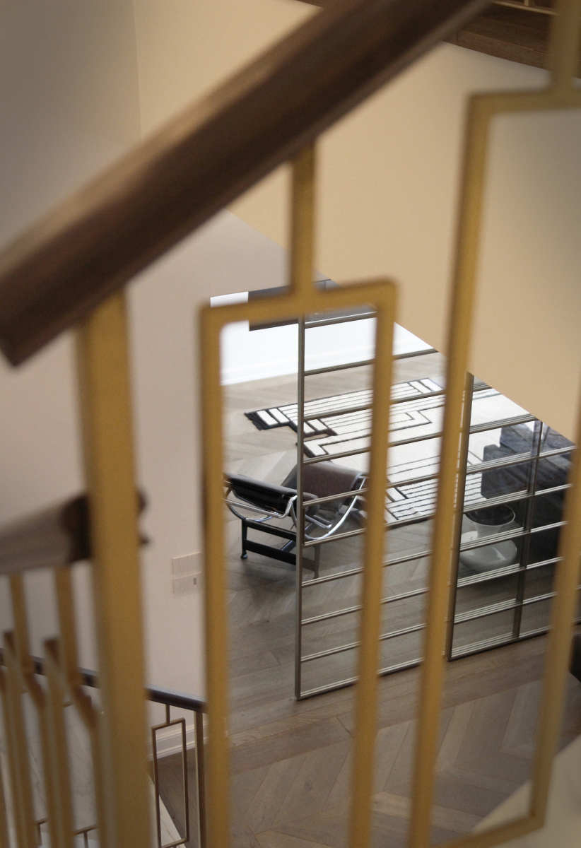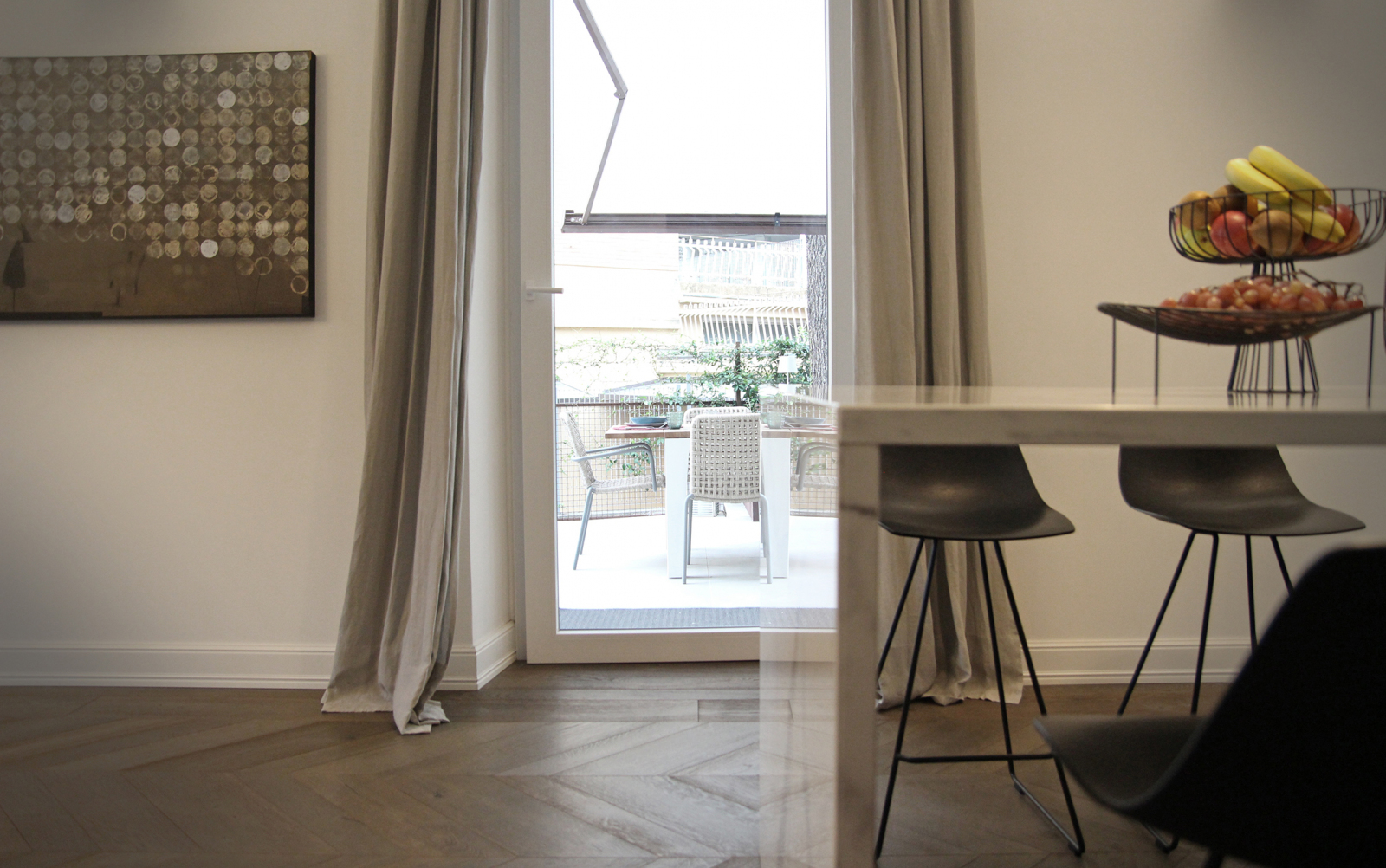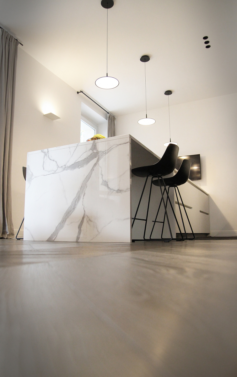 Per garantire un’armonia estetica tra la zona giorno e la zona notte, sono stati utilizzati pannelli scorrevoli Soho di Rimadesio. Questi elementi non solo suddividono gli spazi in modo funzionale, ma aggiungono anche un tocco di eleganza e modernità agli ambienti.