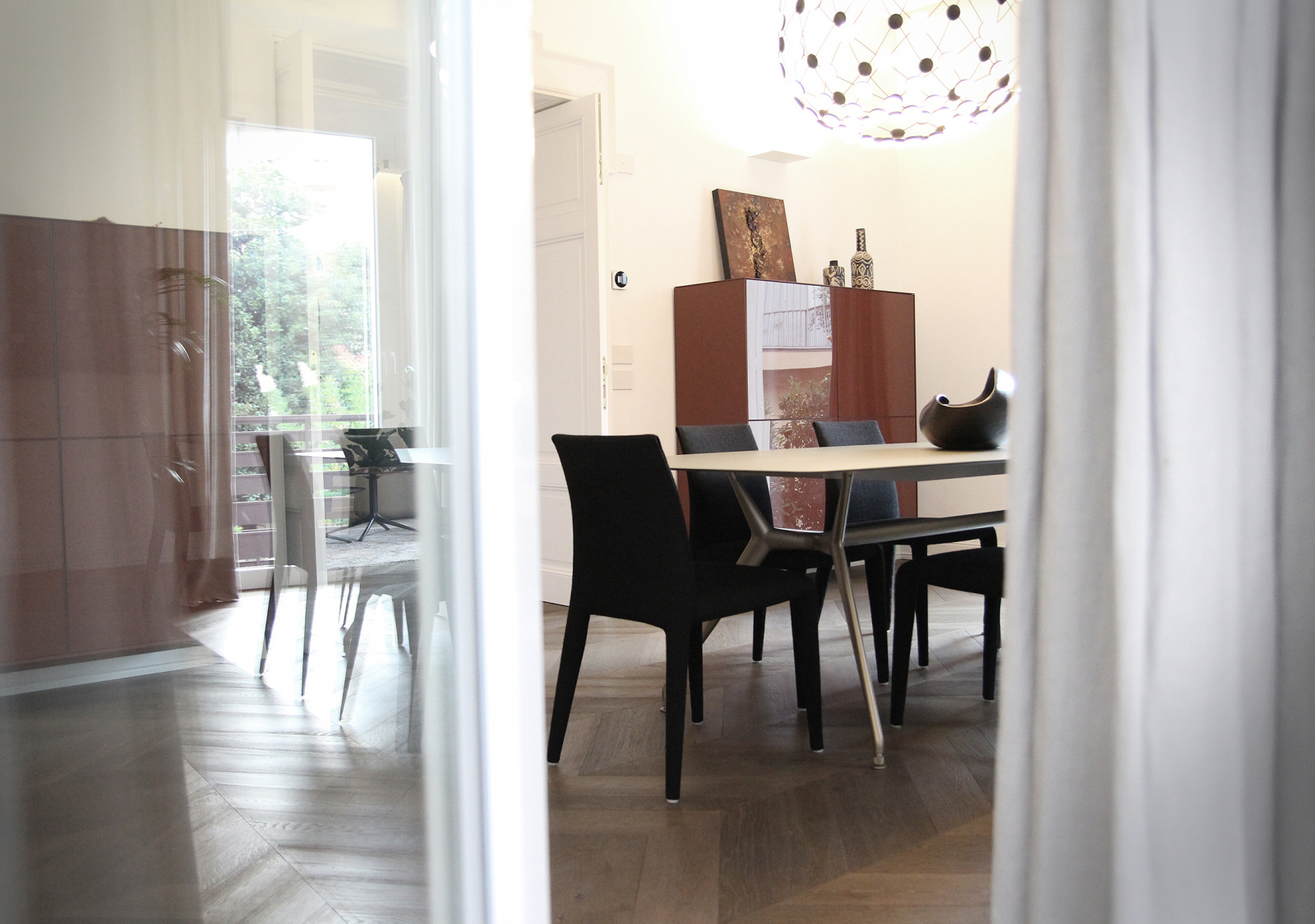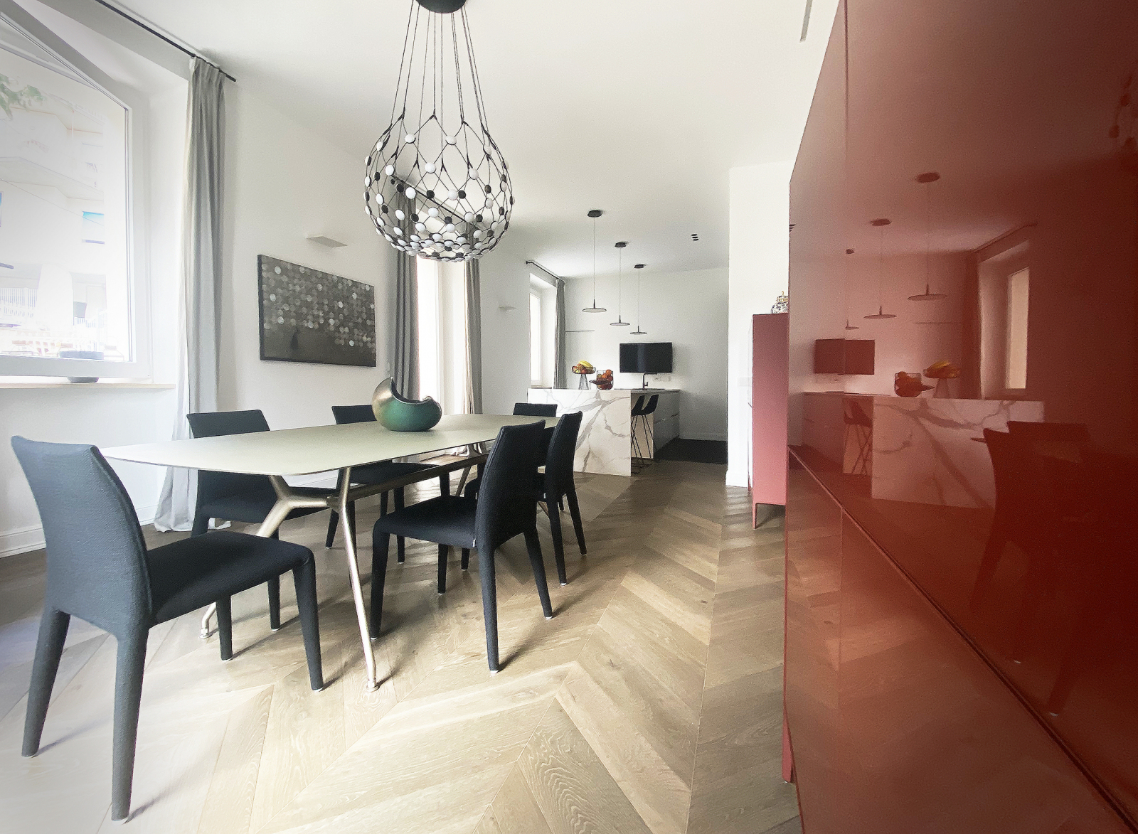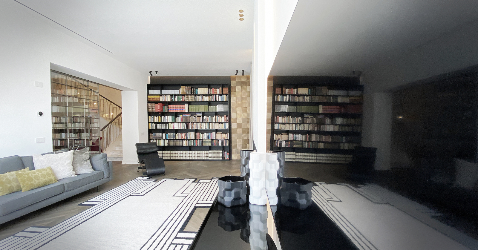 Per di più le librerie a parete modello Flat di B&B Italia sono state scelte per la loro capacità di combinare estetica e praticità, offrendo ampio spazio per libri e oggetti decorativi. Tra l’altro nella zona pranzo, il tavolo Manta di Rimadesio, abbinato alle sedie Vol ou Vent di B&B Italia, creano un ambiente conviviale e sofisticato. In fine i contenitori in vetro laccato della collezione Self di Rimadesio aggiungono un tocco di lusso e luminosità all’insieme.