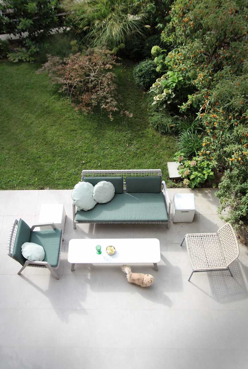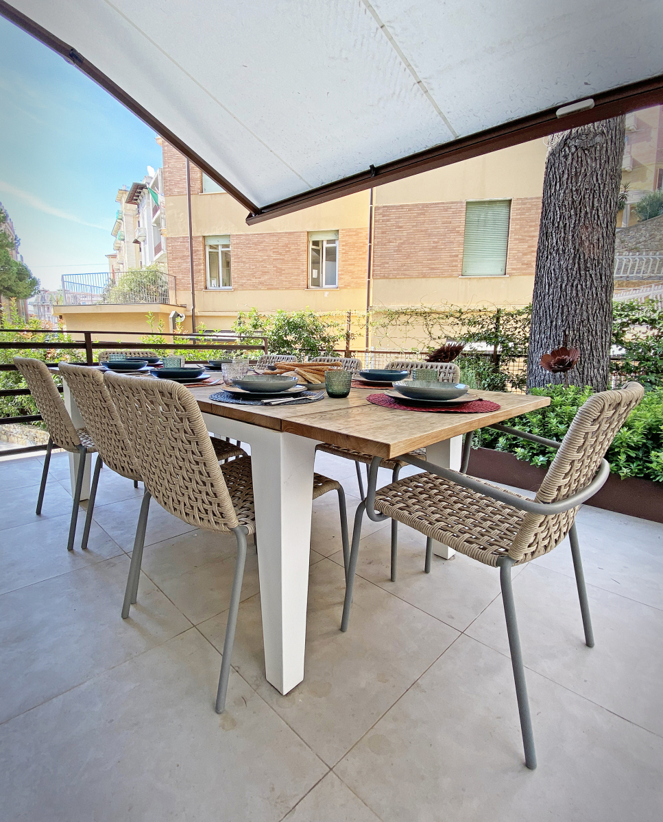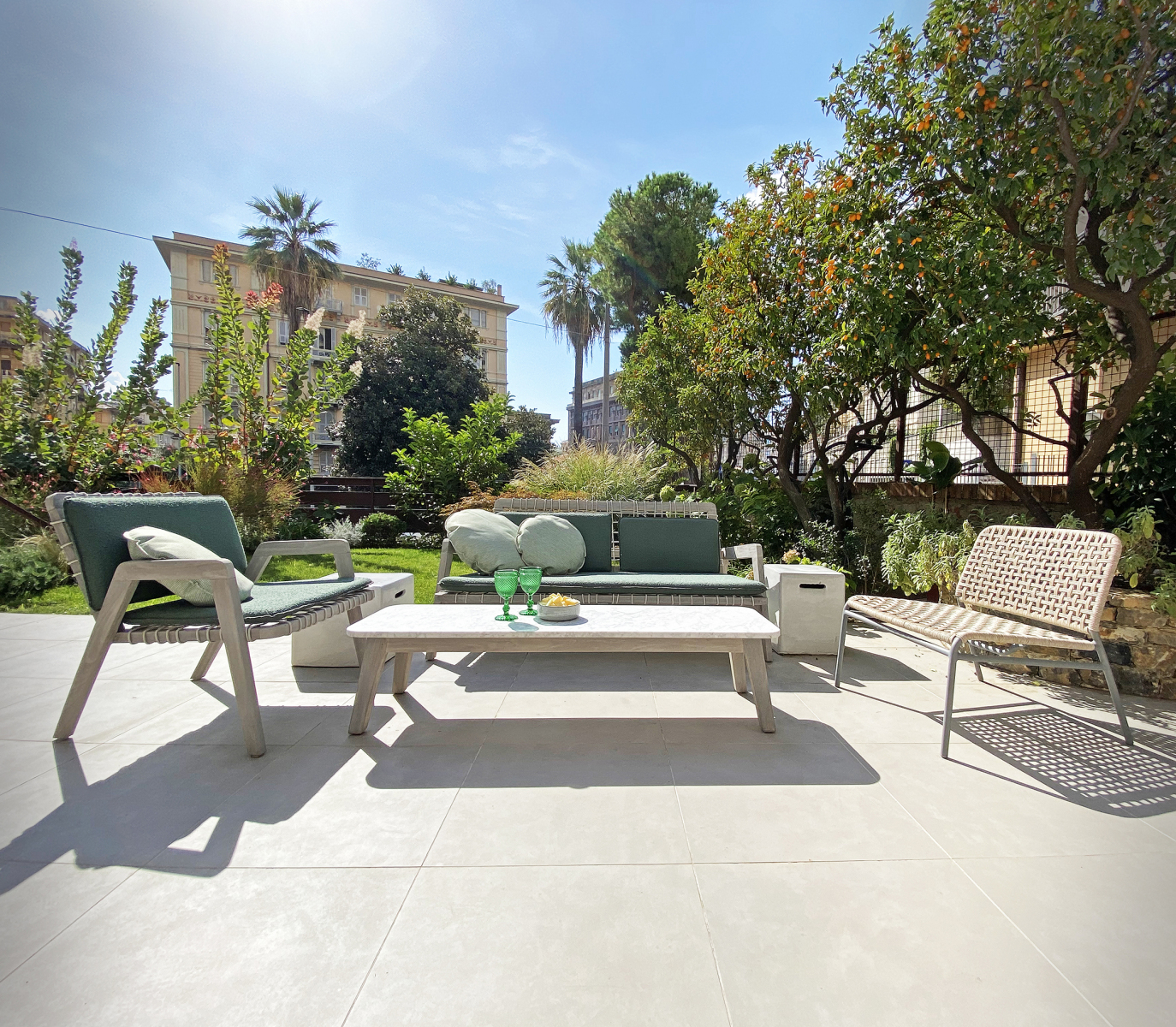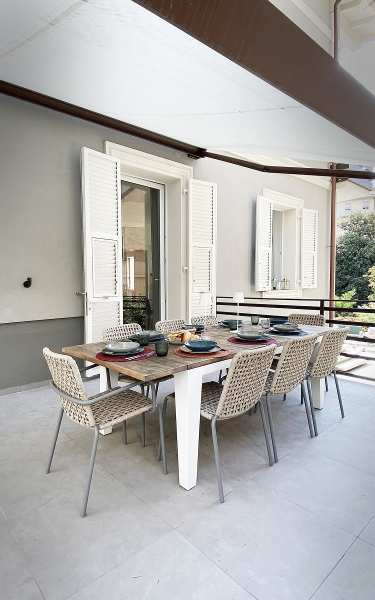 La zona outdoor che caratterizza questa villa con giardino a La Spezia è stata valorizzata con l’arredo delle collezioni Gervasoni, creando uno spazio esterno elegante e funzionale, ideale per momenti di relax e socializzazione.