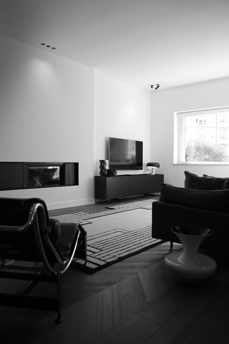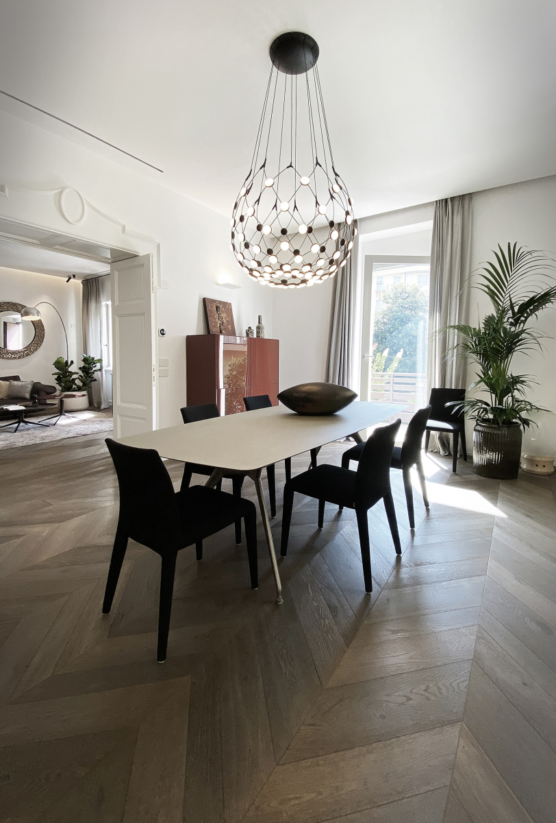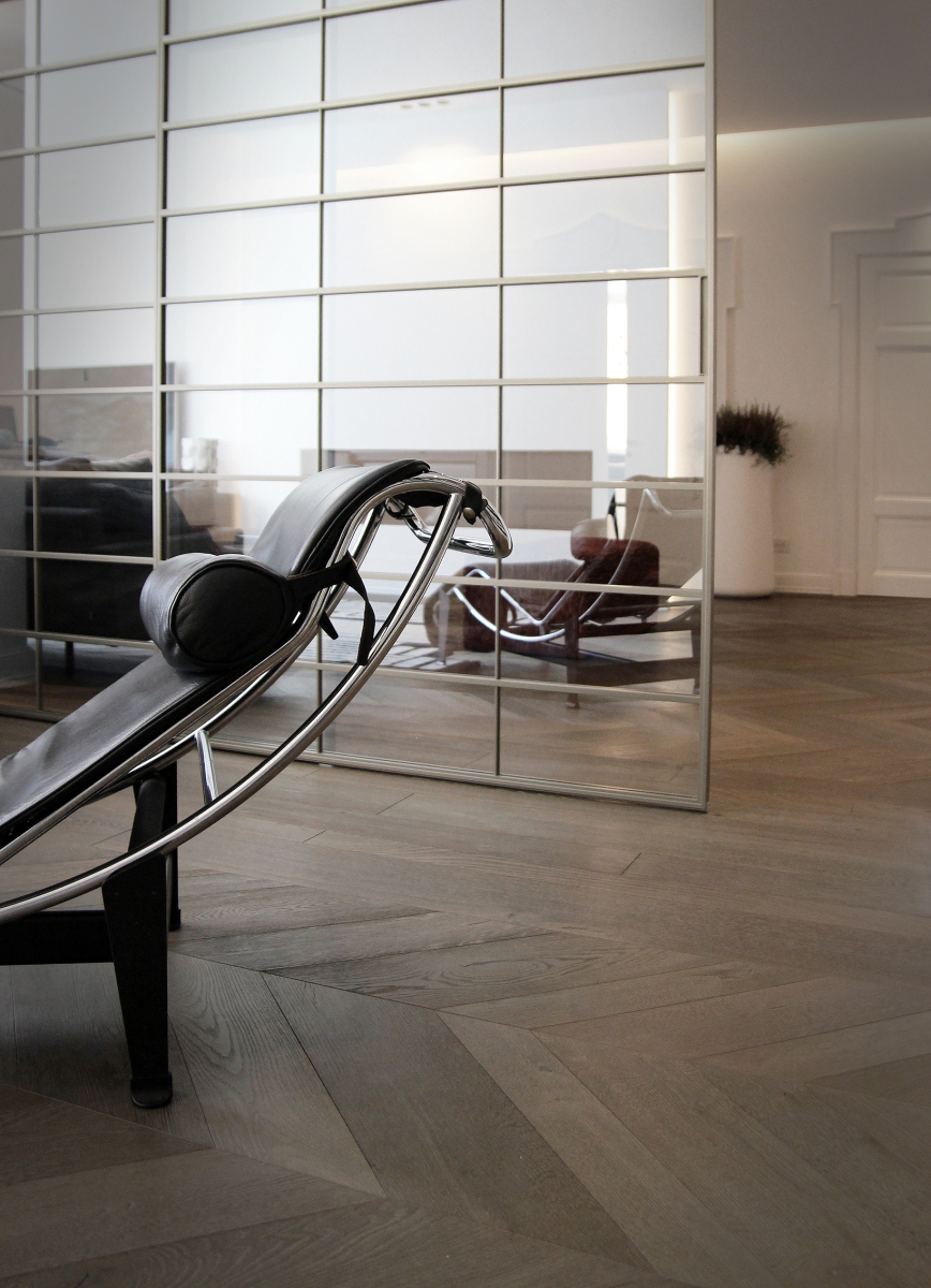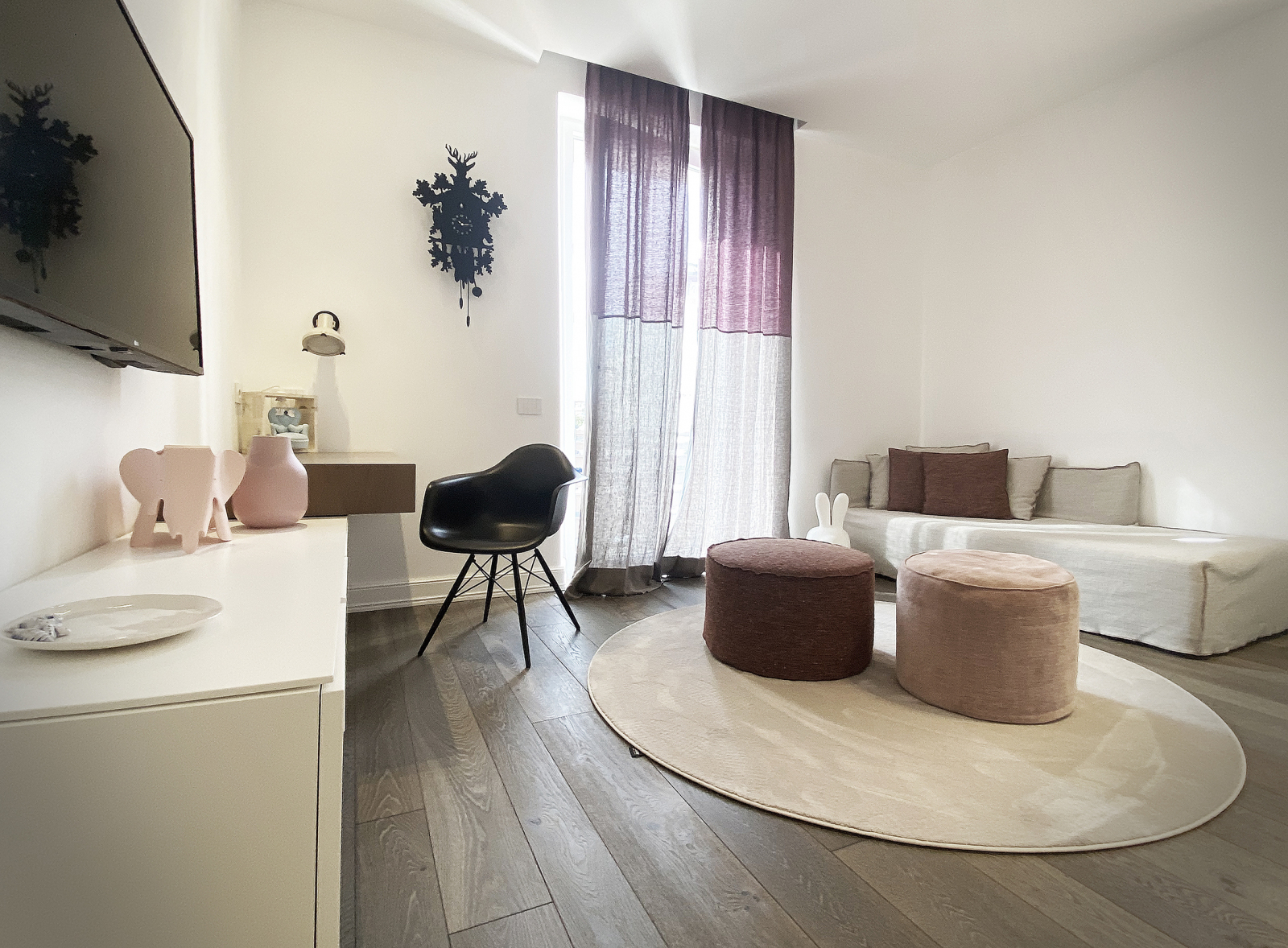 Il living è stato arredato con un divano componibile in tessuto modello Square 16 di De Padova, che offre flessibilità e comfort. La Chaise Lounge LC4 di Le Corbusier, un classico del design, aggiunge un elemento di prestigio e raffinatezza.