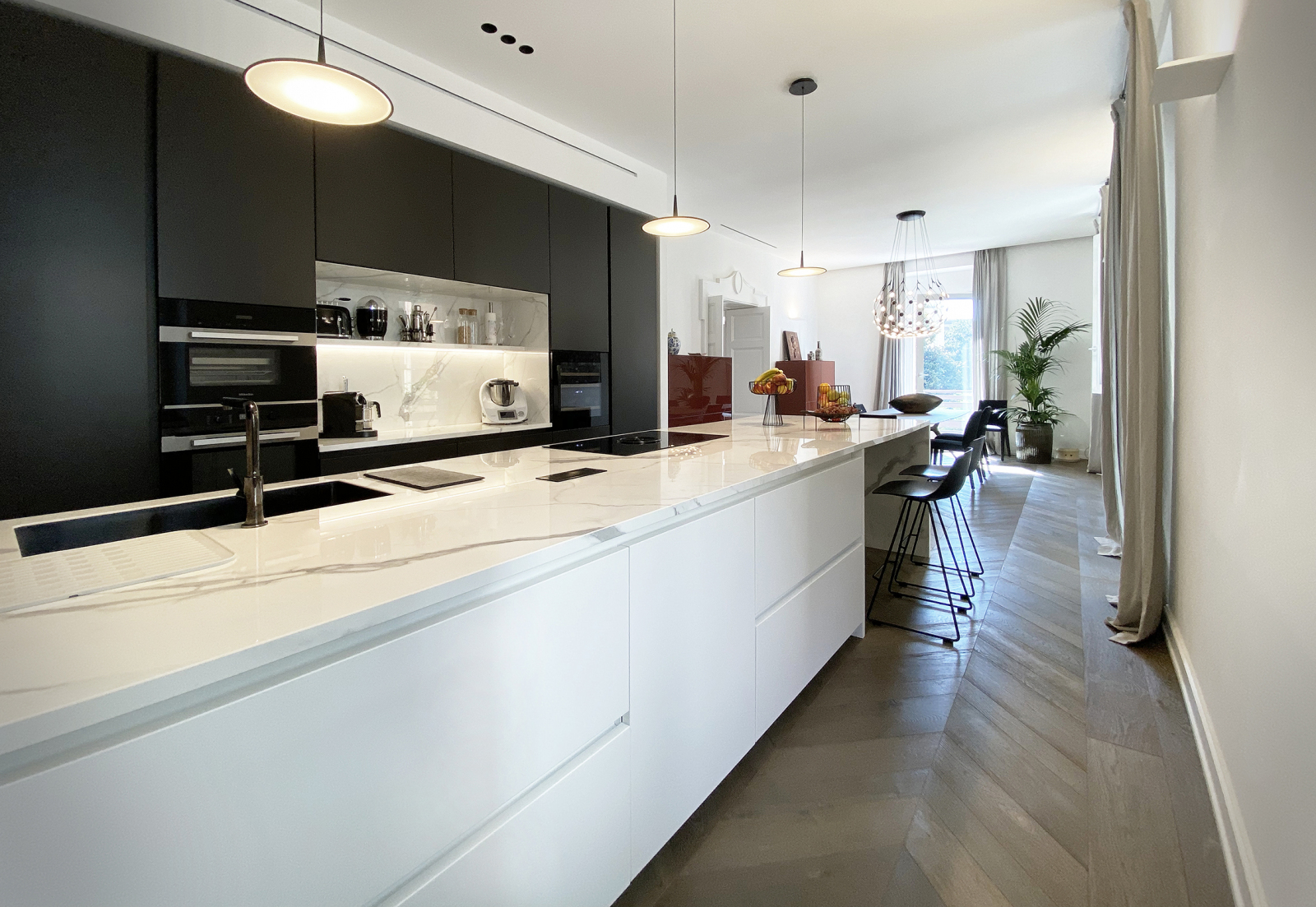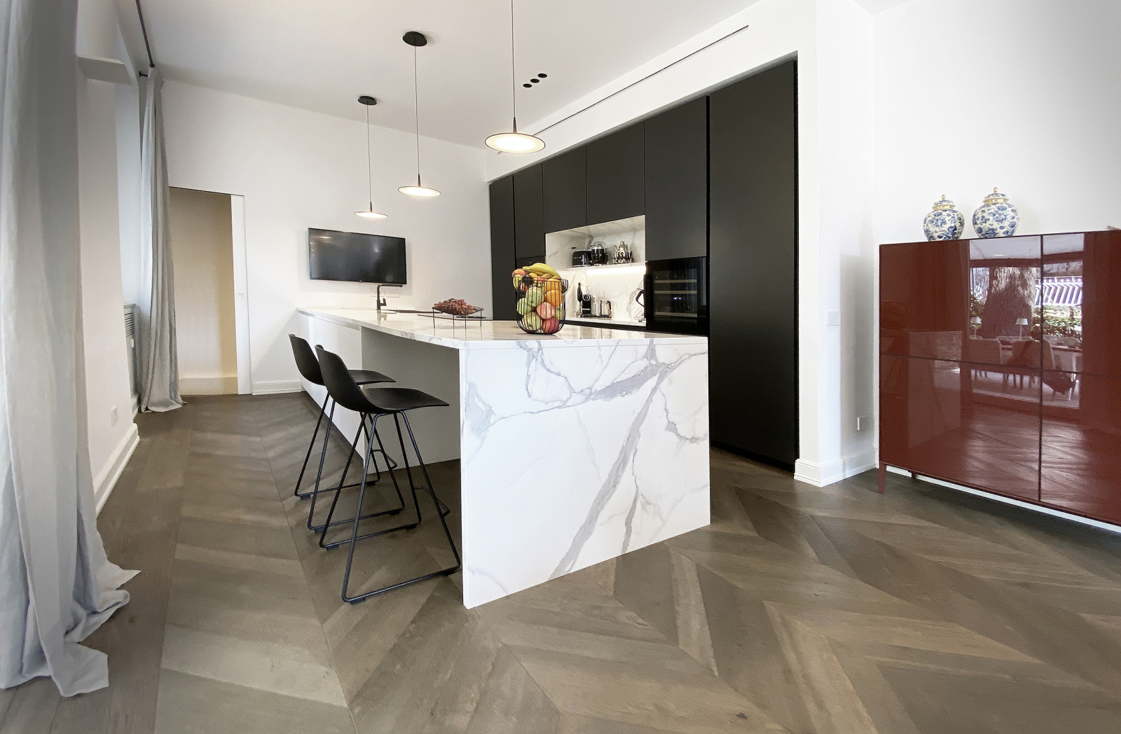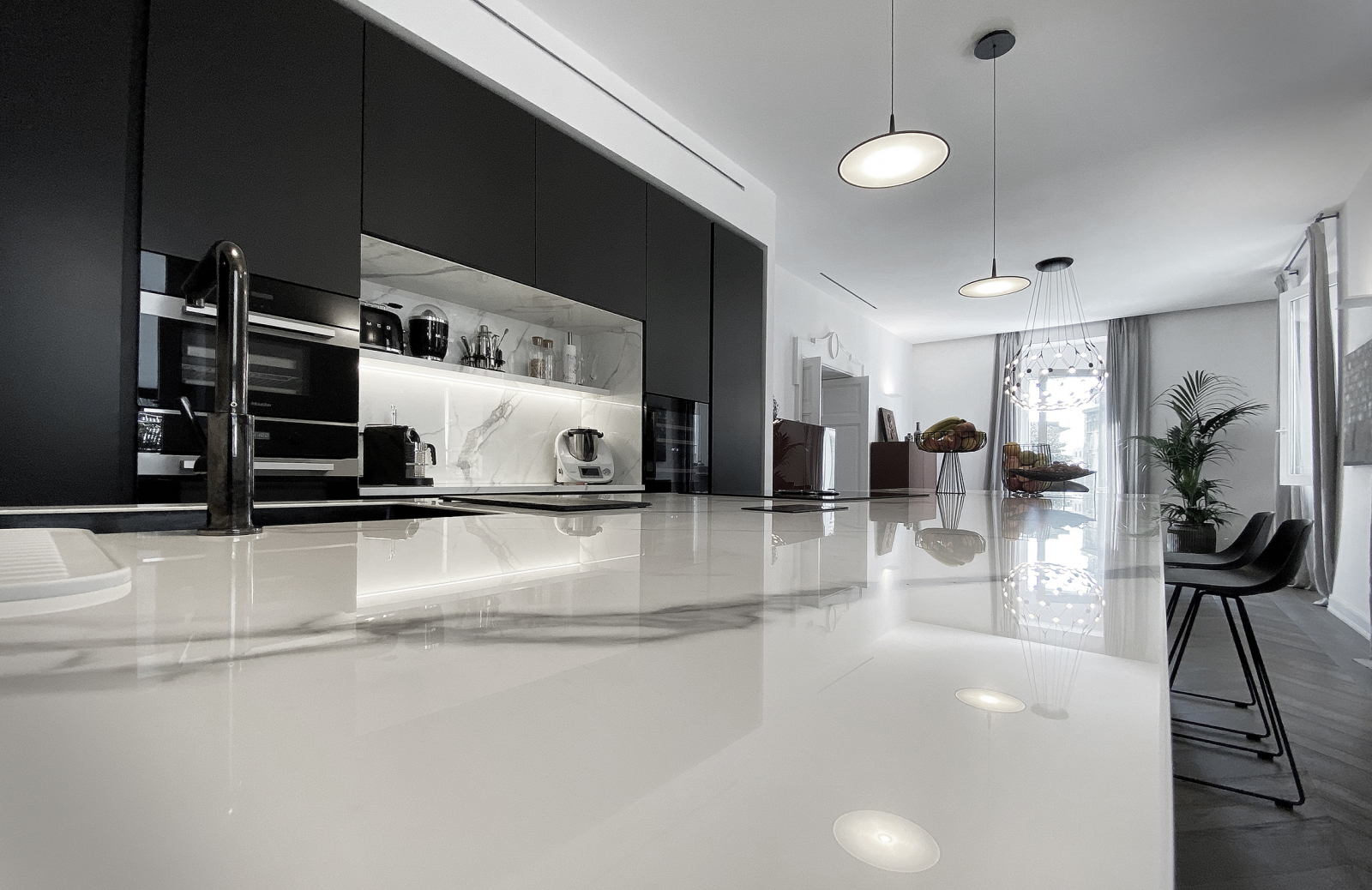 In questa villa con giardino, il cuore della casa è la cucina, la quale è stata progettata con un’attenzione particolare all’estetica e alla funzionalità. È stata scelta una cucina laccata opaca di Arrital Kitchen, dotata di elettrodomestici Miele di ultima generazione. Il piano cottura a induzione con sistema di aspirazione Bora rappresenta una soluzione innovativa, che unisce tecnologia avanzata e design elegante. Il top in ceramica bianco statuario di Ariostea aggiunge un tocco di raffinatezza, mentre gli sgabelli Miun di La Palma completano l’insieme con il loro design moderno e confortevole.