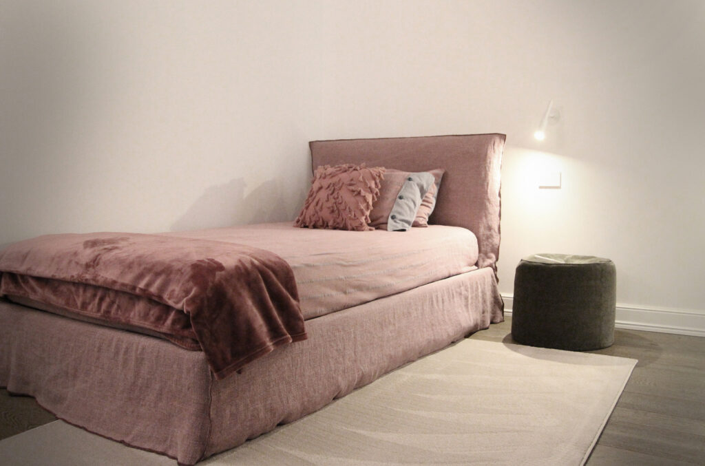Infine, nella camera singola, troviamo il letto che fa parte della collezione Ghost di Gervasoni, questa è una scelta che unisce comfort e design, perfetta per garantire un riposo di qualità in un ambiente elegante e accogliente.