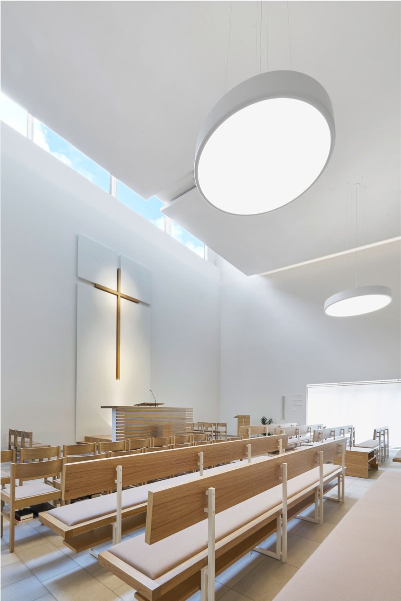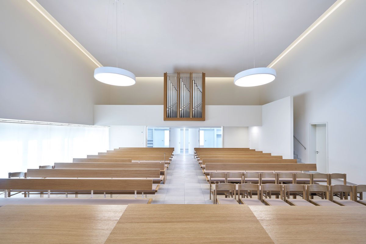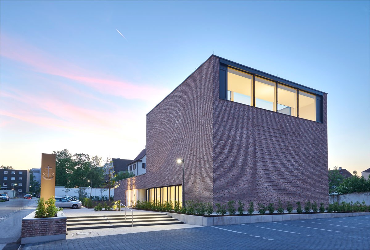 Il progetto si caratterizza per la semplicità delle forme, per un’architettura essenziale, silenziosa e solenne e per la grande attenzione prestata alla presenza della luce, sia di giorno che di notte. A tale scopo, su entrambi i lati dell’altare è stato posto un lucernario vetrato, oltre ad inserti colorati aggiunti alle vetrate del lato sud che di giorno brillano dall’esterno verso l’interno e, se la chiesa è illuminata di sera, dall’interno verso l’esterno. Sul lato occidentale dell’edificio si trovano il guardaroba, la sagrestia e le sale polivalenti, mentre il foyer collega l’area polifunzionale alla chiesa. Dall’atrio, punto di partenza della prima pietra visibile attraverso una lastra di vetro, si forma un tracciato che, realizzato grazie alla disposizione geometrica della pavimentazione, oltre a dividere le aree comuni, conduce all’ingresso alla chiesa, all’estremità della quale di trova l’altare rialzato.