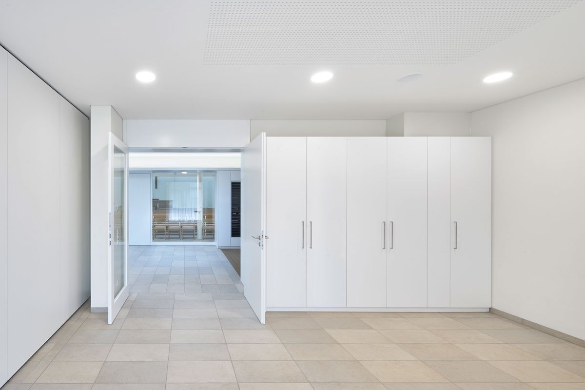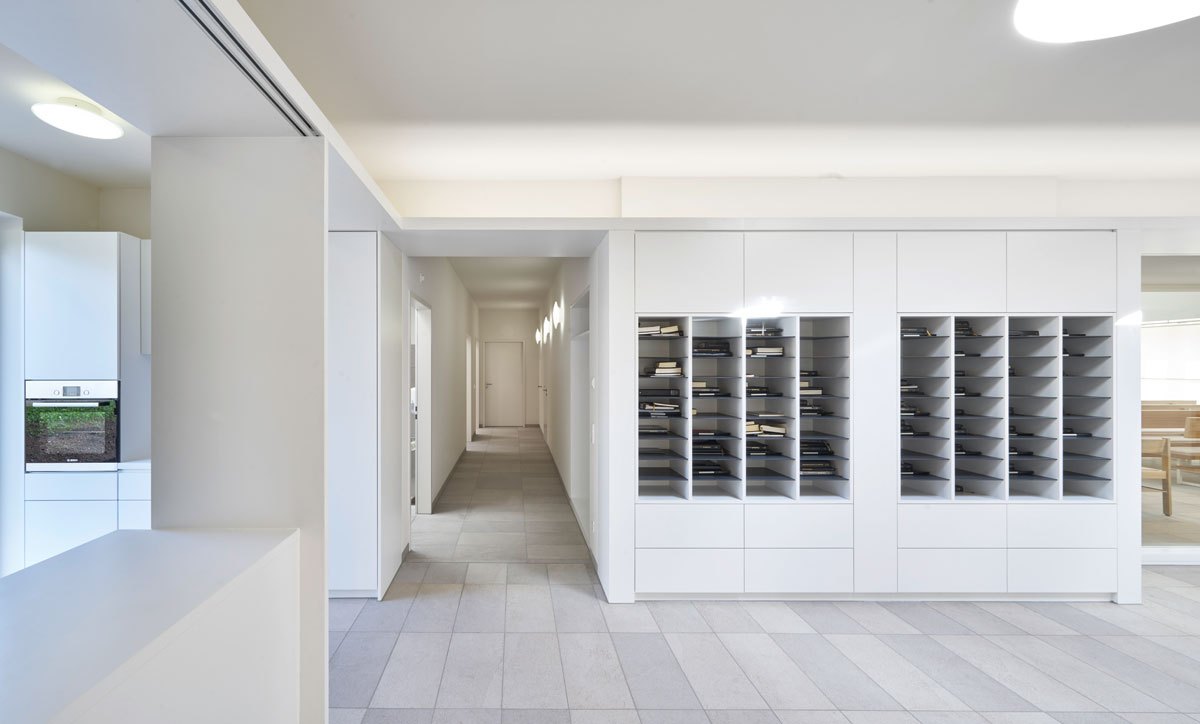 La monocromia del materiale ceramico, di Casalgrande Padana, scelto per l’intera pavimentazione edificio – collezione Mineral Chrom Grey nel formato 30×60 cm – risulta coerente con l’intera struttura e concorre, insieme alla linearità dei volumi, alla purezza del colore bianco di pareti e soffitti e al calore del legno dei mobili e dell’altare, alla creazione di un’atmosfera sobria, equilibrata e meditativa.