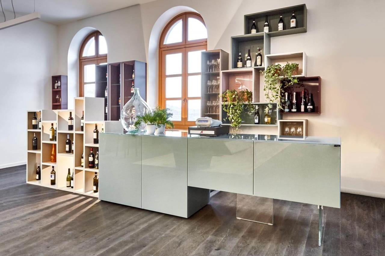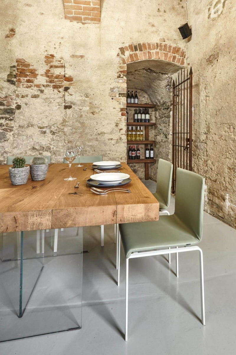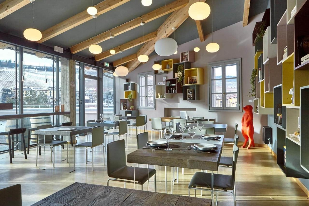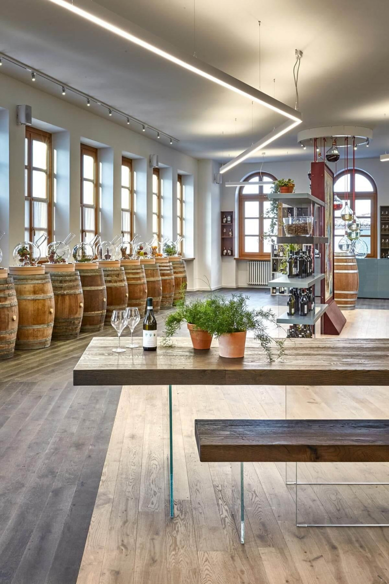 AgriLab è uno spazio dedicato alla ristorazione e agli eventi, si sviluppa su due piani e diventa luogo ideale per cene e degustazioni. Le tonalità degli arredi giocano sui colori delle vigne – mattone, paglia, argilla, cocco, cipria – e sulle sfumature del vino, riprese dai contenitori 36e8 e dal colore delle pareti, che rendono l’ambiente caldo e accogliente. Il bancone bar Air in legno Wildwood si accompagna ai tavolini quadrati Air circondati da sedie Dangla. La libreria Lagolinea Weightless, in una composizione che ricorda un grappolo d’uva, fa da cornice alle scale che conducono al piano inferiore.