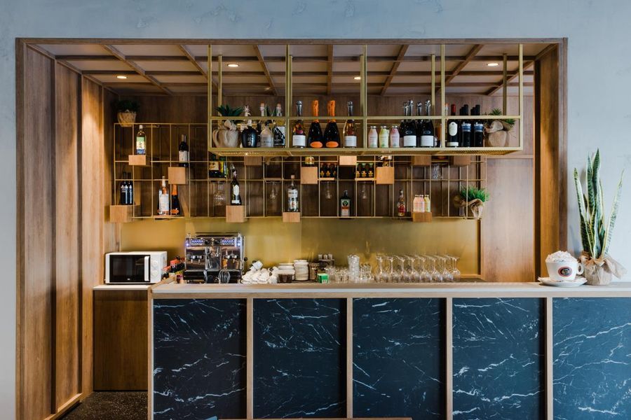Per rivestire il bancone del bar sono invece state utilizzate le lastre in gres porcellanato effetto marmo della collezione Marmoker Nero Creta nel formato 60×120 cm.