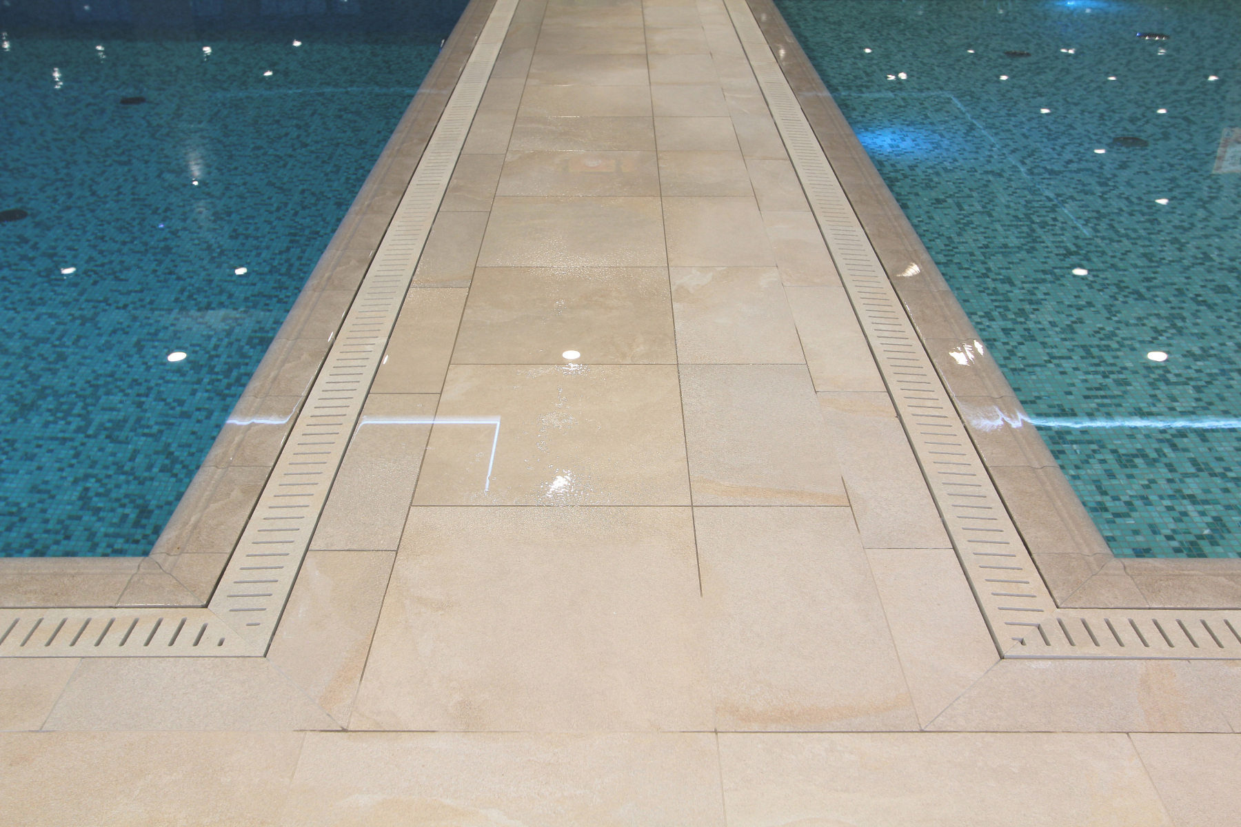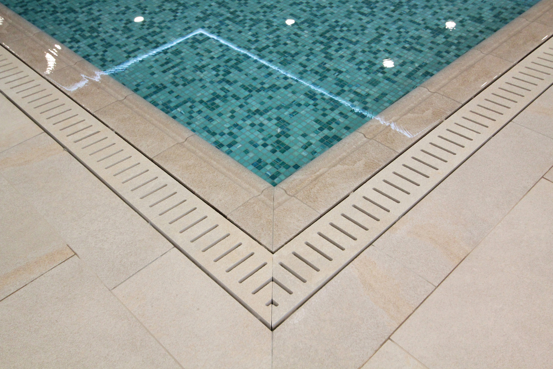 Grazie ai raccordi che ridefiniscono i bordi vasca e alle piastrelle in gres porcellanato che rivestono il sistema di drenaggio, il pavimento della piscina crea un insieme elegante e uniforme mentre gli elementi tecnici dell’infrastruttura risultano quasi invisibili.