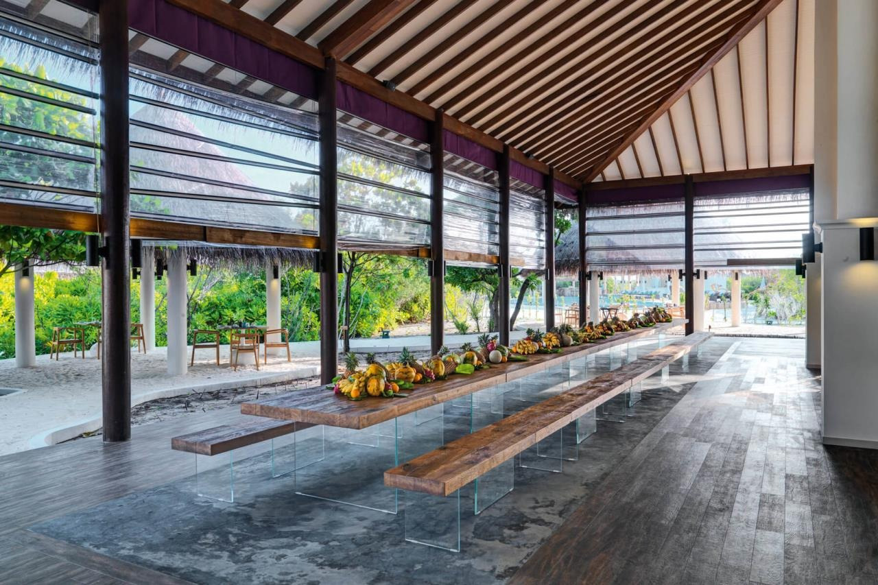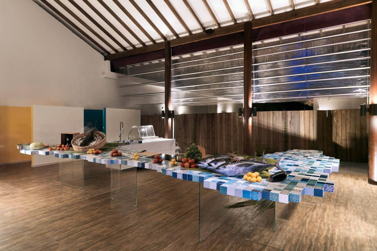 Nella Reception le altalene Soft Swing accolgono gli ospiti, per lasciare il mondo alle spalle e concedersi una parentesi di amore per se stessi in un contesto inimmaginabile. Nella zona Ristorante, immerso nella vegetazione, un LAGO COMMUNITY TABLE abbatte le barriere culturali e avvicina mondi e popoli diversi. Accanto a questo tavolo in legno vissuto, una cucina 36e8 MadeTerraneo è dedicata agli eventi di showcooking.