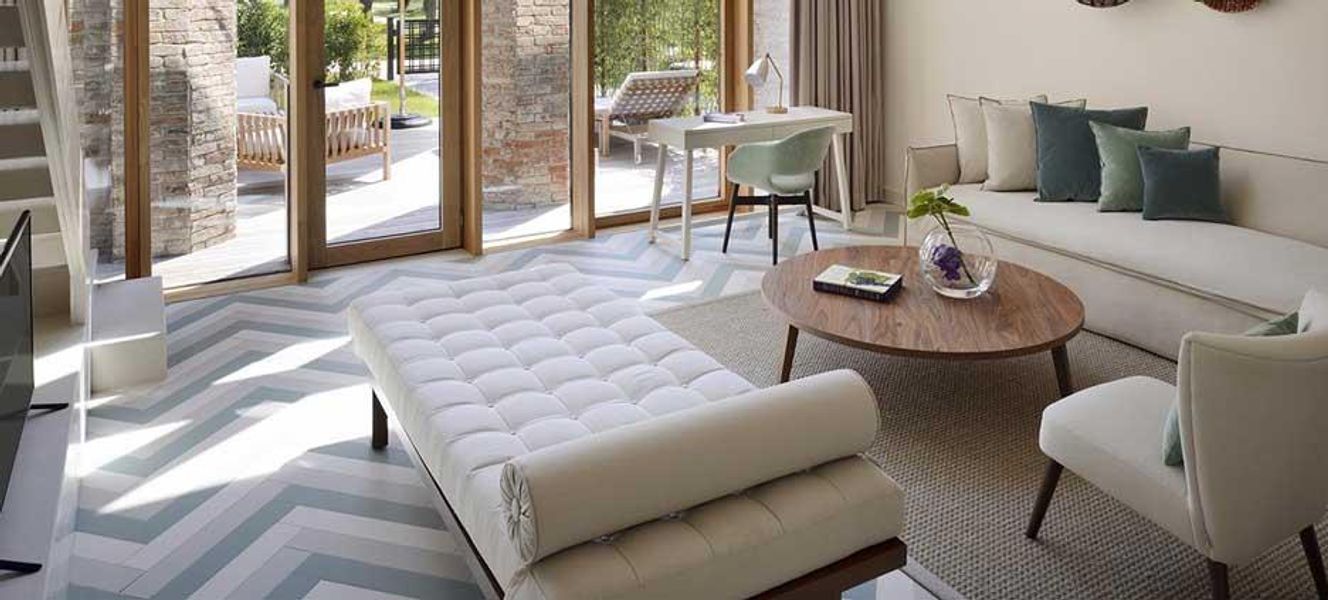 Dal masterplan generale al recupero degli edifici esistenti, l’intervento del JW Marriot Venice Resort & Spa da parte dello studio Matteo Thun & Partners + Luca Colombo è stato costantemente ispirato da una visione olistica e quindi considerato nella sua armonica totalità. Senza trascurare nessun dettaglio, la scelta della pavimentazione delle camere è stata appositamente disegnata, per richiamare in modo coerente, i vecchi pavimenti in legno del ristorante dell’ex Dopolavoro: l’espressivo impiego dei listelli in gres porcellanato di Casalgrande Padana in quattro colori pastello (Architecture Warm Grey e White, Unicolore Acquamarina e Rosa Antico) in formato 10×60 cm posati “a spina di pesce con tecnica all’italiana”, ovvero con angolazione a 90 gradi incastrati tra di loro per formare un angolo retto perfetto, richiama alla memoria le raffinate tessiture dei tappeti e concorre ad impreziosire gli ambienti, valorizzando e ampliando le possibilità creative e di utilizzo del materiale ceramico.