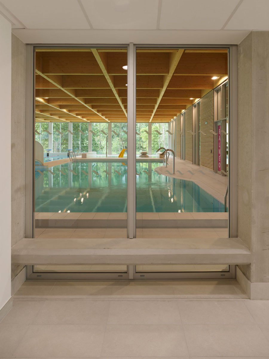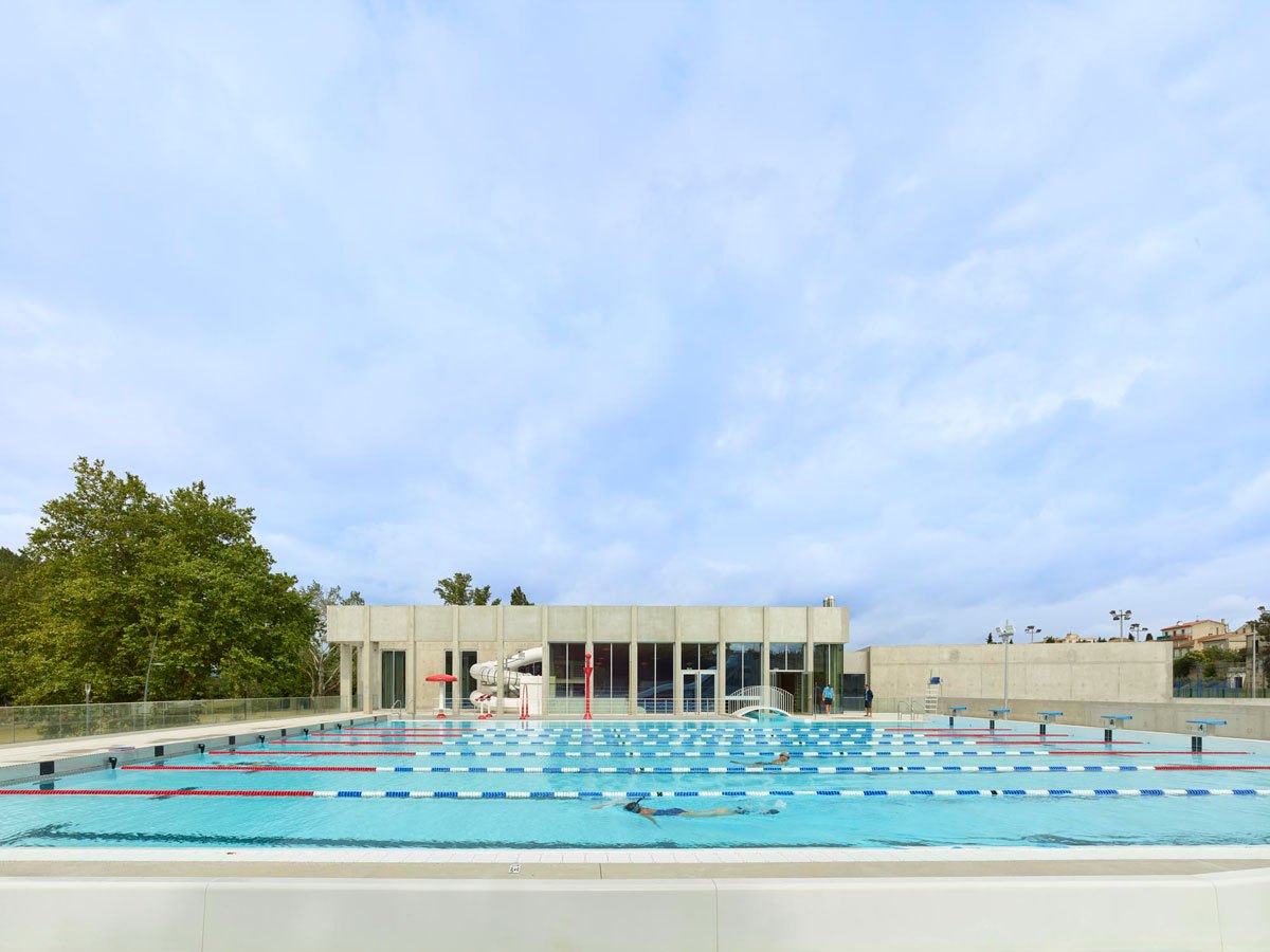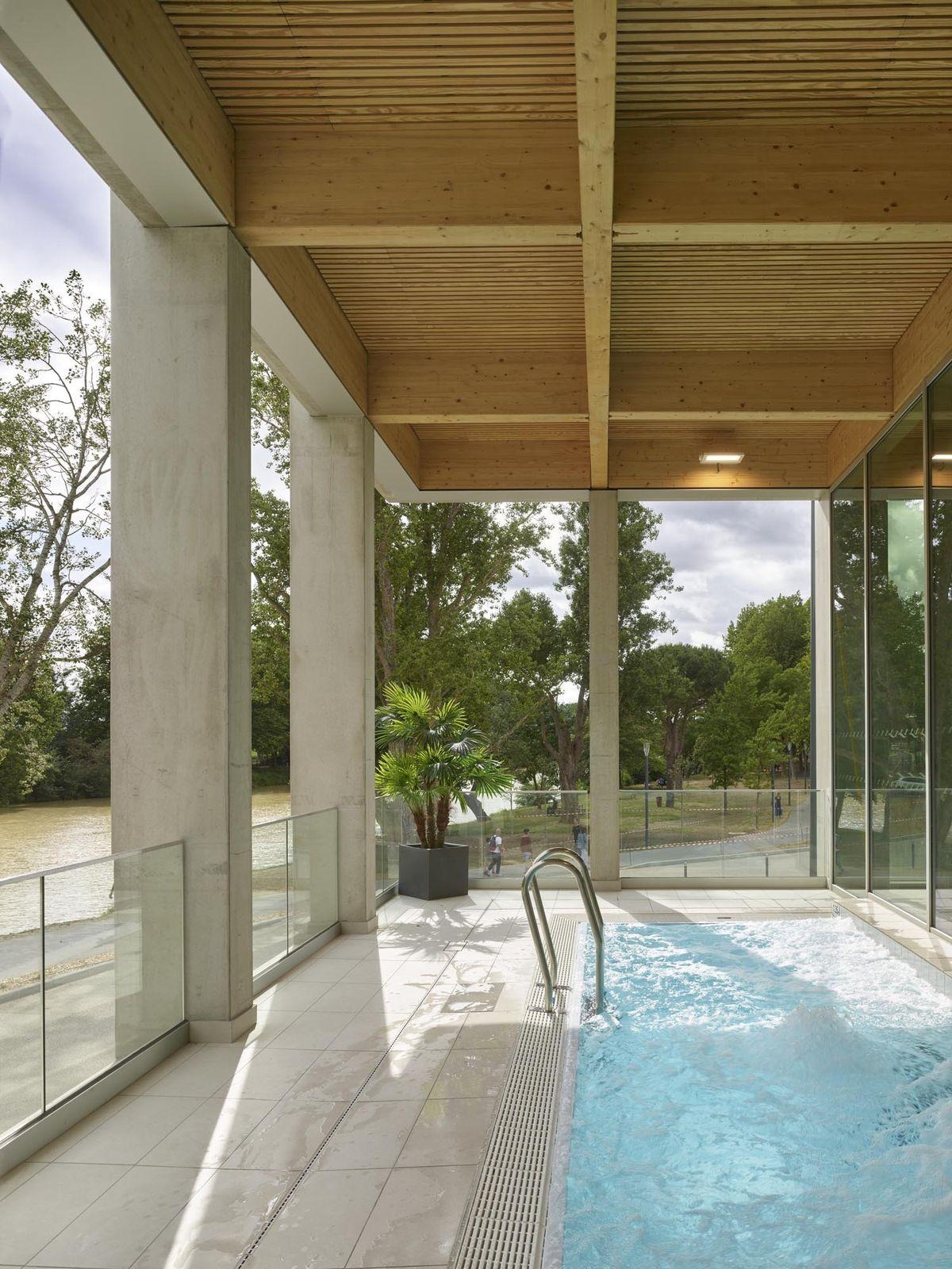 L’atrio del complesso sportivo funge da snodo centrale e grazie ad ampie vetrate e a facili collegamenti tra le diverse aree, l’utente può facilmente orientarsi e osservare tutte le attività che il centro acquatico offre: a nord, lungo il piazzale, è situato lo spazio dedicato alle attività cardio e fitness, sale massaggi, spogliatoi e uffici amministrativi, mentre a sud si trovano due piscine coperte, rispettivamente di 25 m per 15 m e di 15 m per 10 m per le attività di acquagym. L’area comprende anche una sauna, l’hammam, docce sensoriali, una piscina con idromassaggio e una vasca esterna di 25 m per 21 m con solarium e con vista sul fiume Aude.