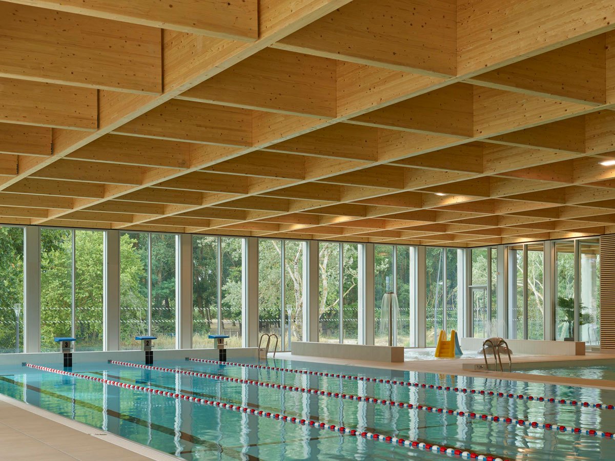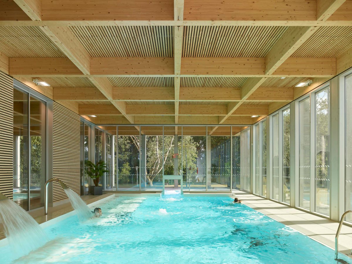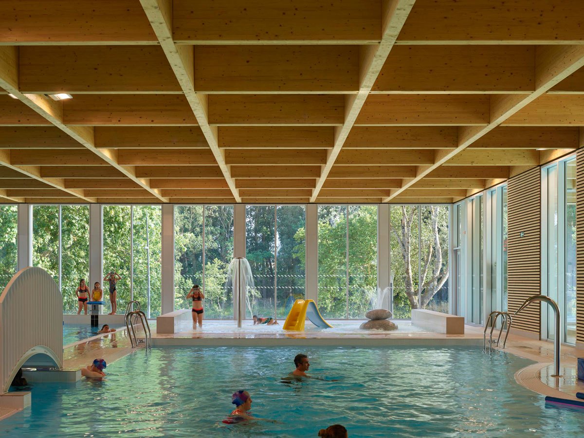 L’atrio del complesso sportivo funge da snodo centrale e grazie ad ampie vetrate e a facili collegamenti tra le diverse aree, l’utente può facilmente orientarsi e osservare tutte le attività che il centro acquatico offre: a nord, lungo il piazzale, è situato lo spazio dedicato alle attività cardio e fitness, sale massaggi, spogliatoi e uffici amministrativi, mentre a sud si trovano due piscine coperte, rispettivamente di 25 m per 15 m e di 15 m per 10 m per le attività di acquagym. L’area comprende anche una sauna, l’hammam, docce sensoriali, una piscina con idromassaggio e una vasca esterna di 25 m per 21 m con solarium e con vista sul fiume Aude.