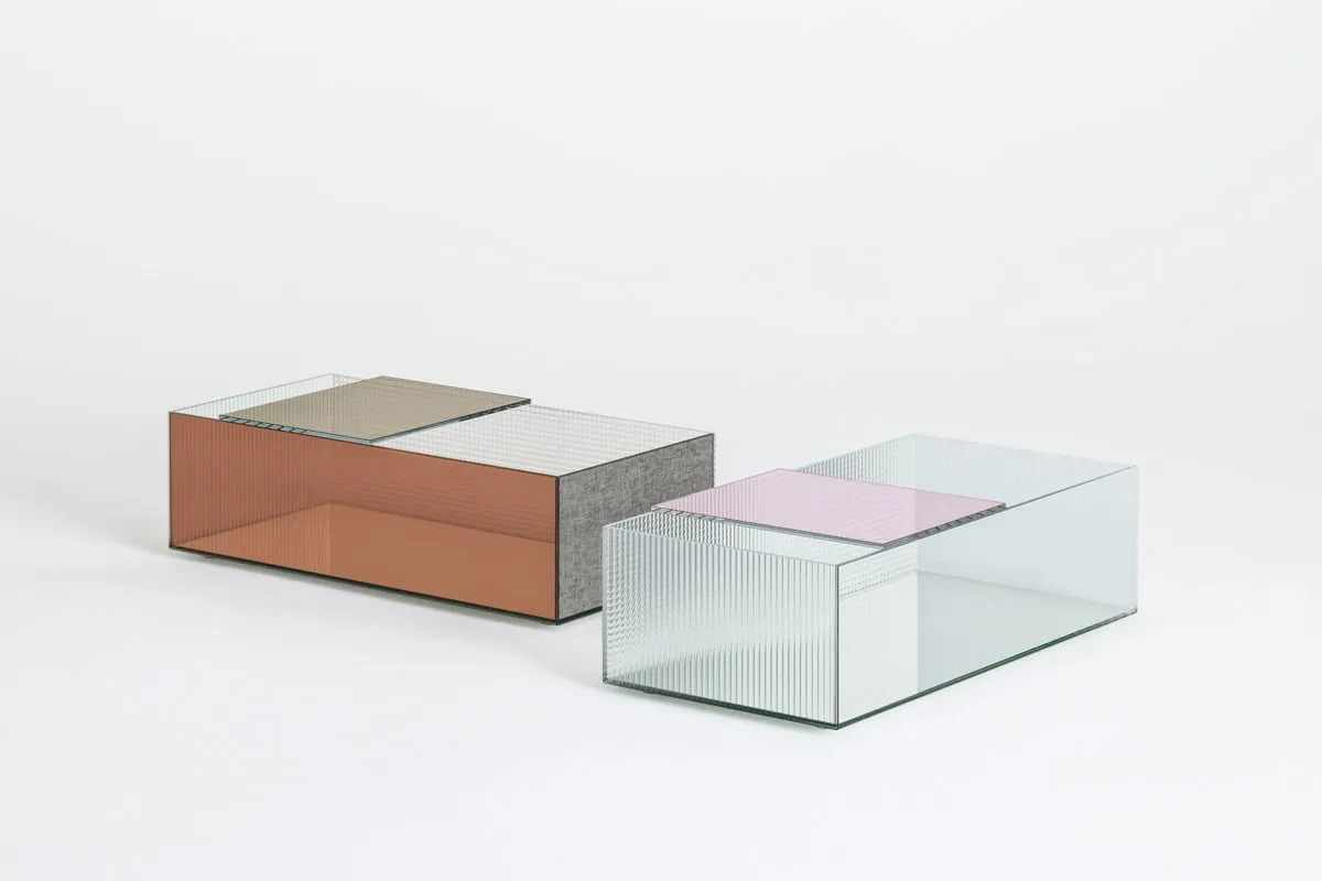 Il tavolino realizzato incollando a 45° lastre di cristallo stratificato di diverse qualità e finiture ha il fondo in specchio, e un piano in appoggio, posizionabile a piacere. VAI ALLA SCHEDA