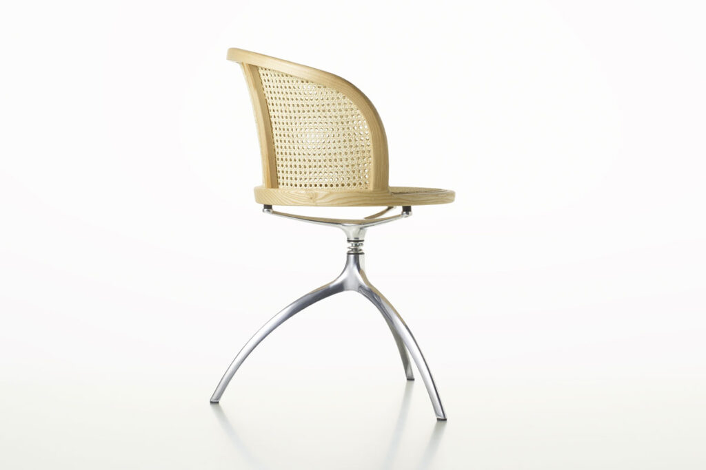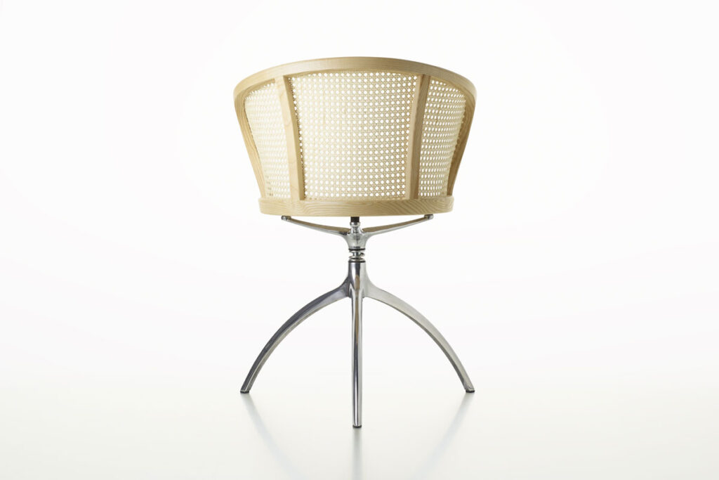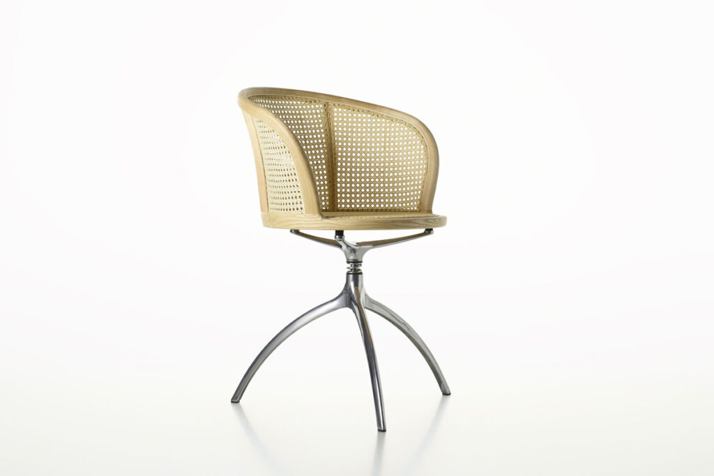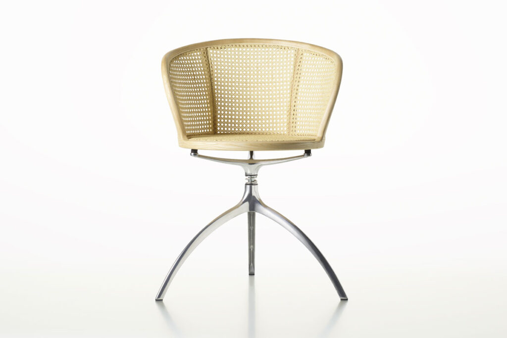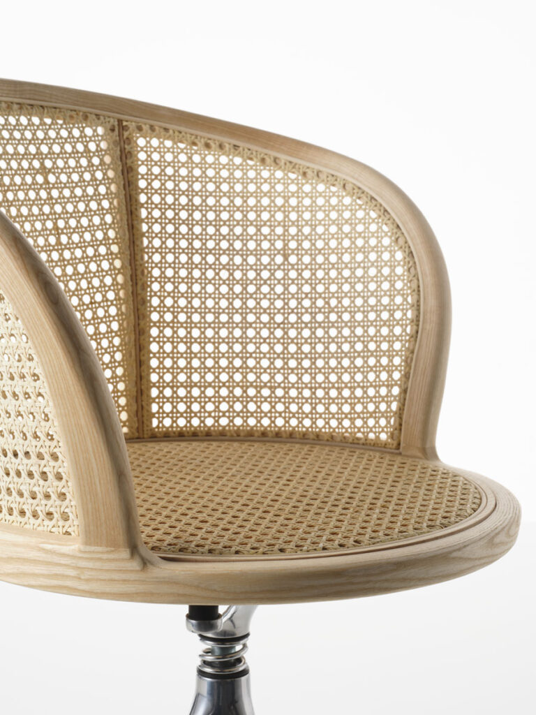 Young Lady, iconica e scultorea, è il risultato della genialità del designer Paolo Rizzatto nel creare progetti senza tempo, in grado di mantenere il loro fascino anche nel corso degli anni. La poltroncina utilizza un materiale della tradizione come la paglia di Vienna, largamente utilizzato nelle storiche sedute Thonet, e ne rinnova il linguaggio. Intelaiata in una tornita struttura in massello di frassino, la seduta si appoggia su un tripode scultoreo realizzato in alluminio.