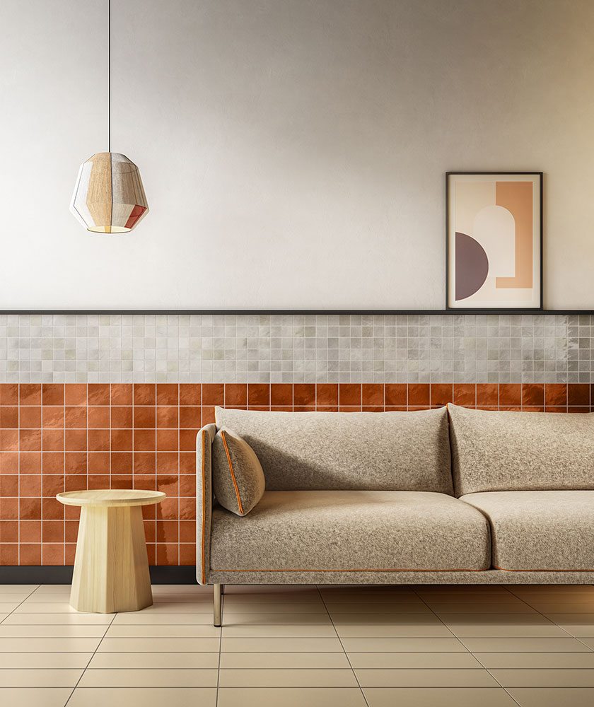 Le piastrelle in gres smaltato si ispirano alle tradizionale piastrelle marocchine e richiamano lo stile artigianale per scaldare l’atmosfera con riflessi cangianti.