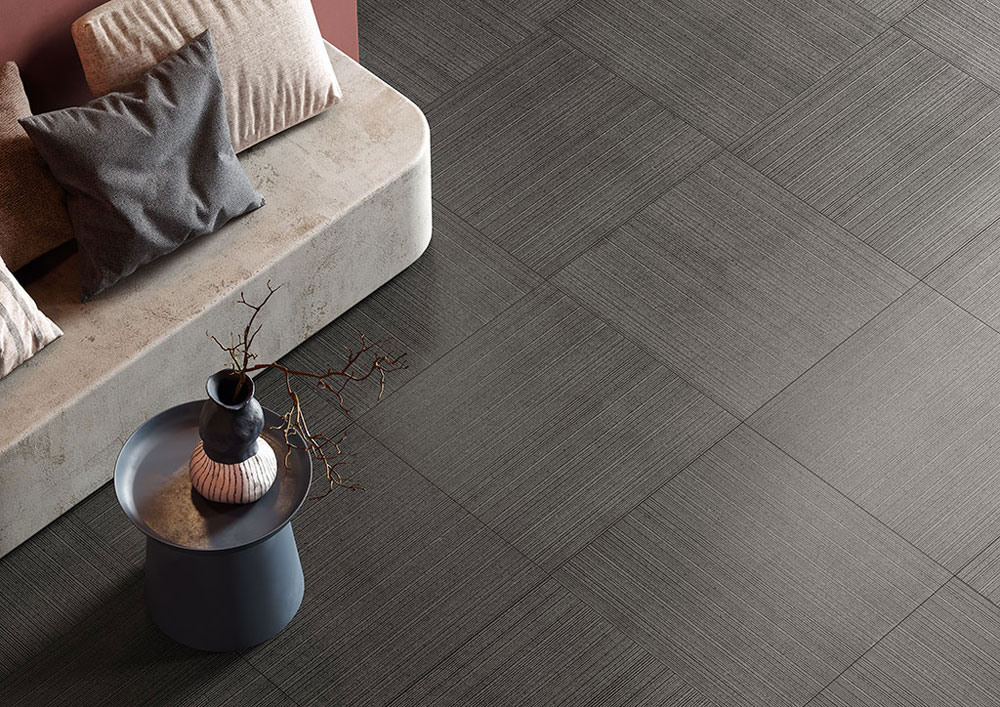 La forza della pietra lavica si traduce in una superficie dal taglio sartoriale, che ricorda un elegante tessuto maschile