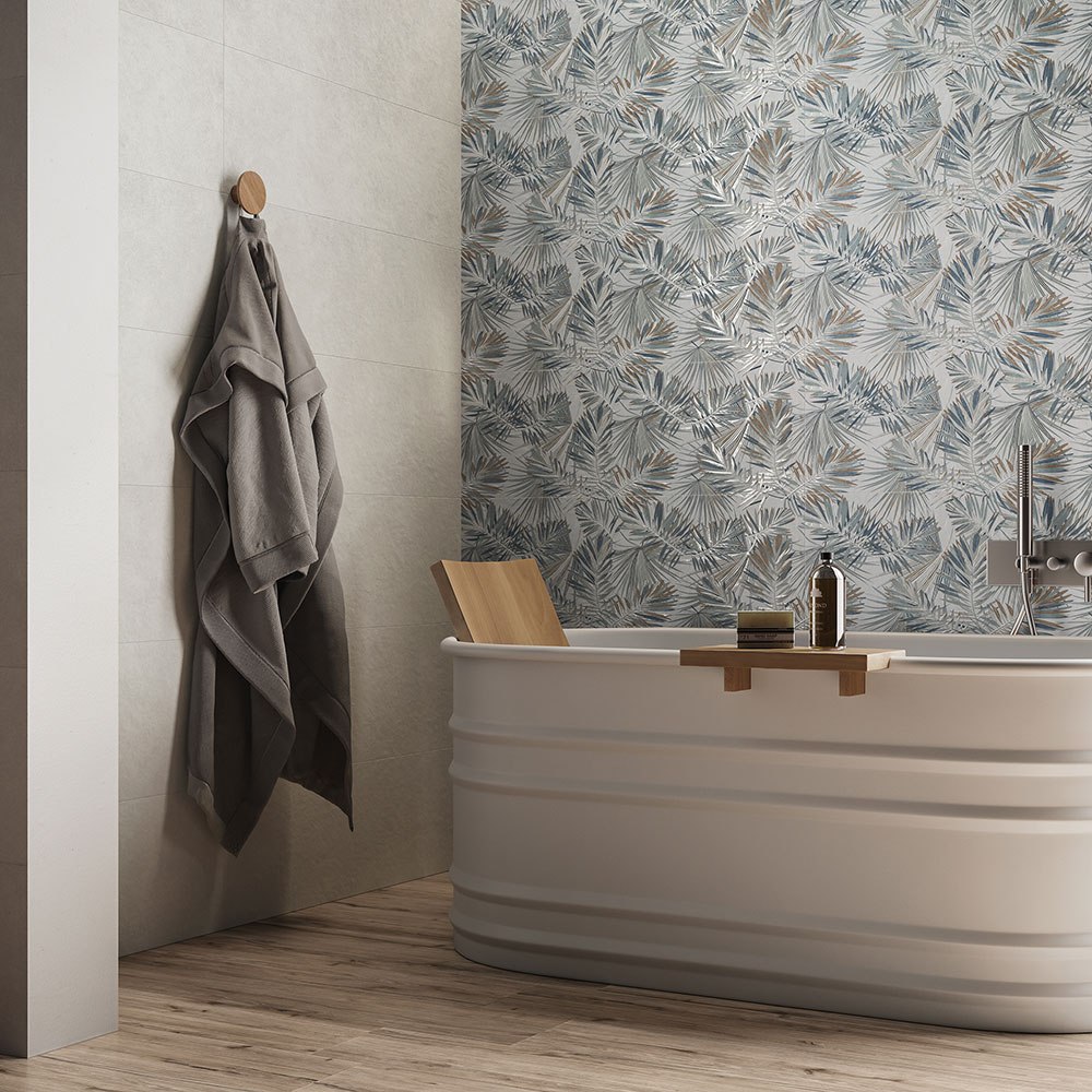 Il gres porcellanato effetto pietra viene esaltato dai rivestimenti in pasta bianca, tra onde sinuose e stame a foliage. E il risultato è chic e discreto.