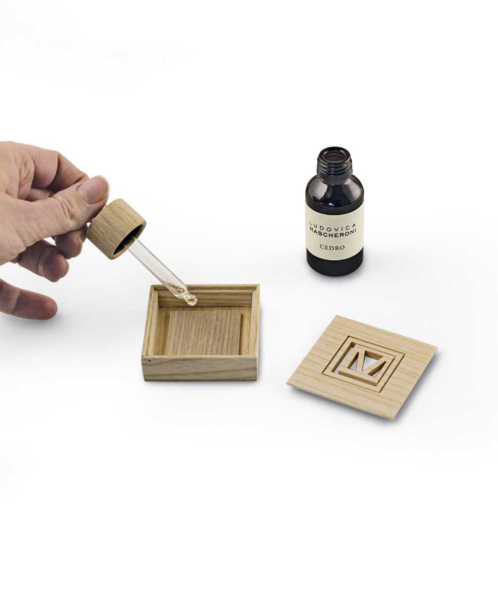 Ludovica Mascheroni. Sette olii raffinati (cedro, eucalipto, alloro, lavanda, cirmolo, ylang ylang e patchouli) e un’elegante custodia di legno: bastano poche gocce e questo kit per profumare tutto il guardaroba.